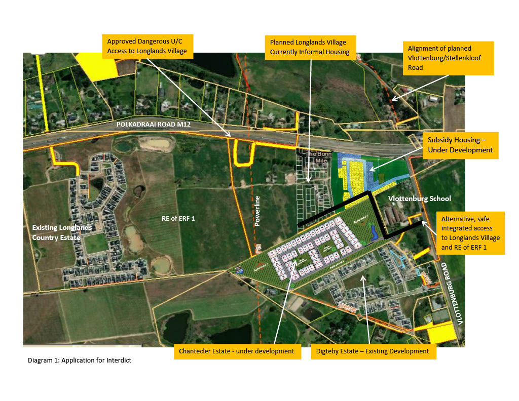 “Dit is ‘n verbreking van ons eiendomsreg en menseregte omdat die Longlands-ontwikkelaars geensins voor hul aansoek om goedkeuring met ons onderhandel het nie oor die ingang na die ontwikkeling, wat ook vier naasliggende eiendomme beïnvloed. Die nuwe ingang sal hierdie kleinhoewes direk verbind met meer as 1 000 inwoners. Die verkeersdruk wat daardeur geskep gaan word, sal die verkeer vanaf die Bonniemile-plase nadelig beïnvloed omdat almal een klein ingang moet gebruik. Verkeersligte gaan verkeersknope veroorsaak en geraasbesoedeling op die M12 sal toeneem. Voetgangers se lewens sal ook in groter gevaar gestel word weens die verhoogde verkeersdruk.