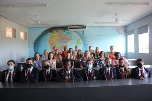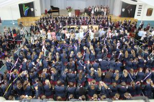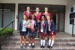 Agter is Paul Roos Gimnasium se hoofleiers – Roché Meyer (hoofseun), Ruben Rossouw en Daniel Dillon (onderhoofseuns) – met Rhenish se hoofleiers, Adri Langford (onderhoofdogter) en Yolisa Tile (hoofdogter) by ons eie hoofleiers, Lona Mhaga (hoofdogter) en Carmen Bonsma (onderhoofdogter), wat voor staan. Foto’s: Stephan MeyerHuisleiers Emma Beukes (Huis Hofmeyr), Salomie Lourens (Huis Joubert) en Tilla-Marié Schreuder (Huis Neethling) met blomkranse in die drie huise se kleure. Foto Stephan MeyerAnnemarie Stofberg (oudonderwyser), Brieta Muller (1949) en Annamarie de Vos (1954) deel ’n oomblik. Foto Stephan MeyerDie klas van 2002 en 2012 saam met die graad 11’s in die geografieklas. Foto Stephan MeyerAlmal vier saam verjaardag – die 147ste. Foto: Stephan Meyer