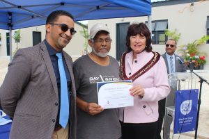 Adjunk BM Jeremy Fasser, Sharon Massena – sy is ñ EPWP werker by Behuisingsadministrasie, Minister Simmers, inwoner, BM Gesie van Deventer en Wyksraadslid Joseph Joon