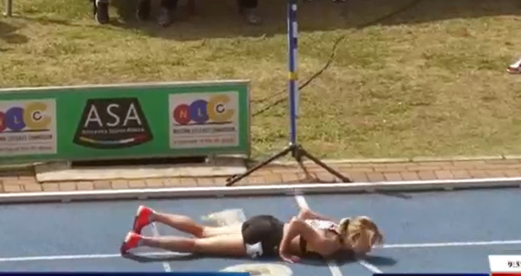 “Sy het in die moeilike toestande aan hitte-uitputting gely. Sy het in die laaste rondte oor die bane begin swenk en in die pylvak inmekaargesak. Sy het daarin geslaag om oor die lyn te kruip en haar skouers oor te kry om ‘n tyd te registreer, wat haar die tweede plek besorg het.”