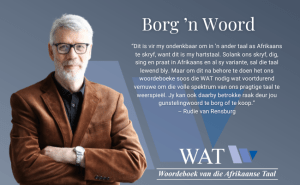 Die skrywer Rudie van Rensburg is op 16 Oktober, Internasionale Woordeboekdag, aangekondig as die nuwe beskermpersoon van die Woordeboek van die Afrikaanse Taal (WAT) se Borg ’n Woord-projek. Hy ondersteun reeds vir jare dié fondsinsameling en die WAT deur telkens ’n woord uit elk van sy nuwe boeke se titels te borg.