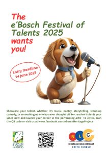 Mintens R10 000 se prysgeld is vanjaar beskikbaar vir deelnemers aan die e’Bosch-talentefees 2025. Dit is bo en behalwe die betaling wat finaliste sal ontvang vir hul deelname aan die gala-geleentheid op erfenisdag, 24 September vanjaar.